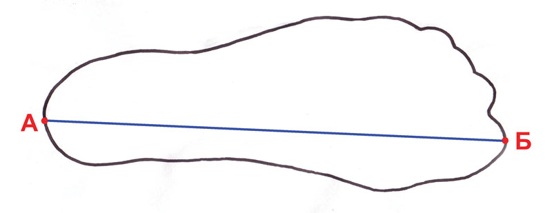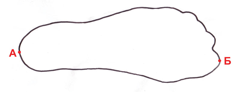 Находим наиболее выступающую точку пяточной части стопы – А, и наиболее выступающую точку носочной части стопы – Б (Рис.2)